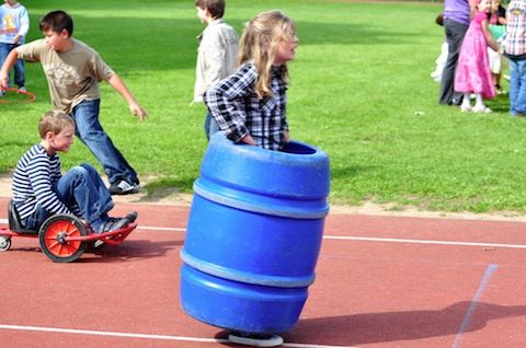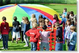 Das Spielmobil des Heimbacher Hofs besuchte uns in der Spielepause. „Bewegte Schule" in Reinform!